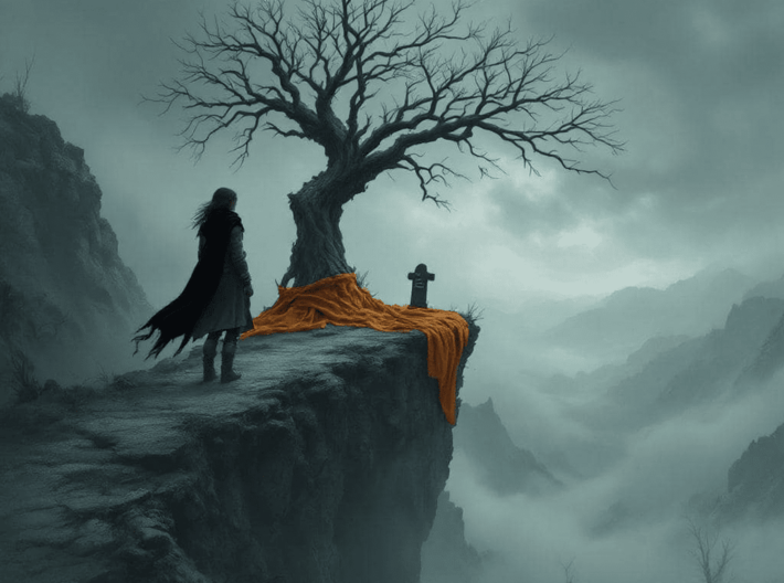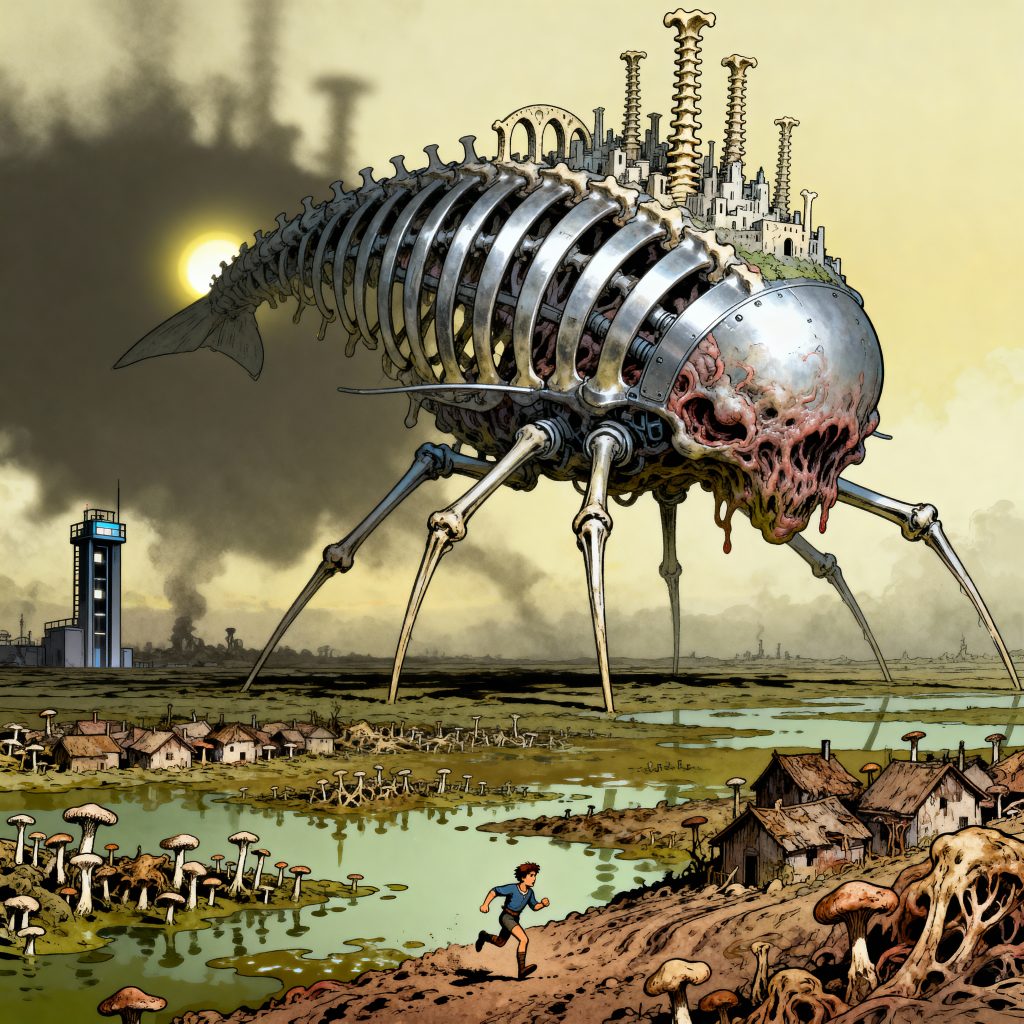 Des vagues vont et viennent sur cet océan ocre et granuleux. La lumière se réfléchit ardemment sur les dunes qui se soulèvent en fracassant les quelques vestiges de civilisation qui traversent l’épais manteau de sable. Au milieu de ce paysage désolé, où les toits qui dépassent font office d’îlots, la pointe d’une tour s’élève en maîtresse des hauteurs. Son horloge, visible de loin, tourne sans fin, sonnant inlassablement les heures d’un même jour éternel.